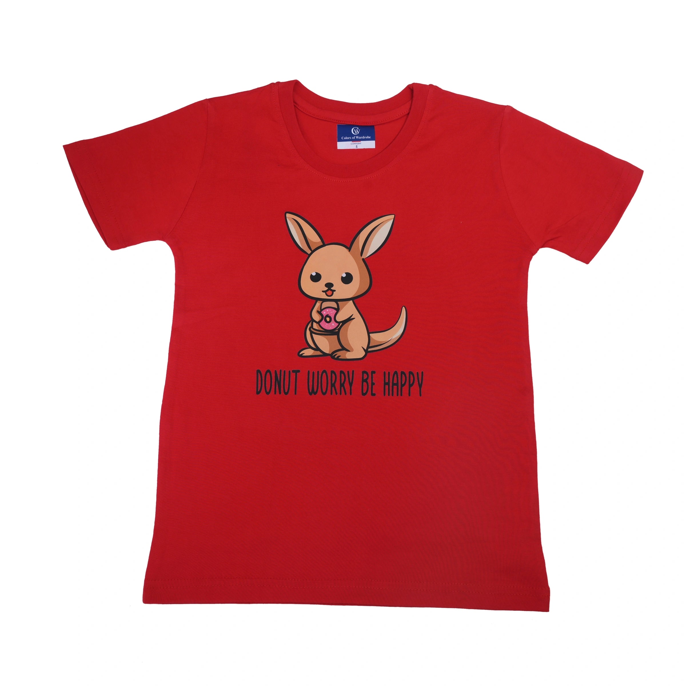 This bright red short-sleeve kids’ t-shirt features a cute kangaroo holding a donut with the cheerful phrase "Donut Worry Be Happy." Crafted from soft, lightweight cotton, it ensures comfort and breathability for all-day wear. Fun, positive, and adorable, this tee is perfect for casual outings, playdates, or everyday adventures.