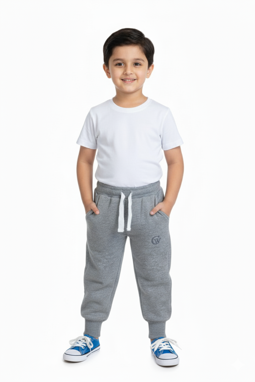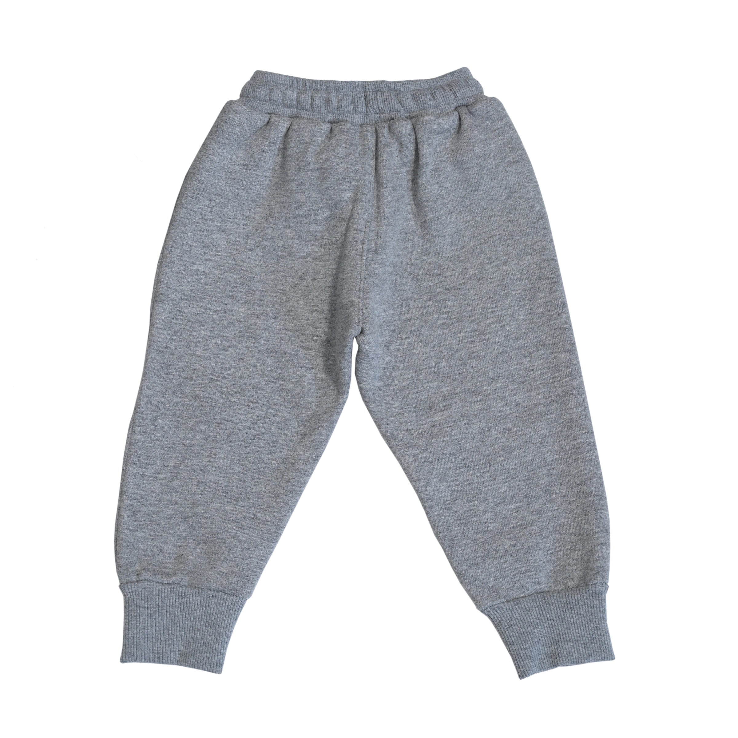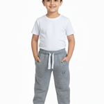 These grey jogger pants are a versatile and comfy choice for everyday wear. Designed with an elastic waistband and adjustable white drawstring, they ensure a perfect fit for active kids. The ribbed cuffs add a snug finish, while the soft, breathable fabric makes them ideal for playtime, school, or lounging in style.