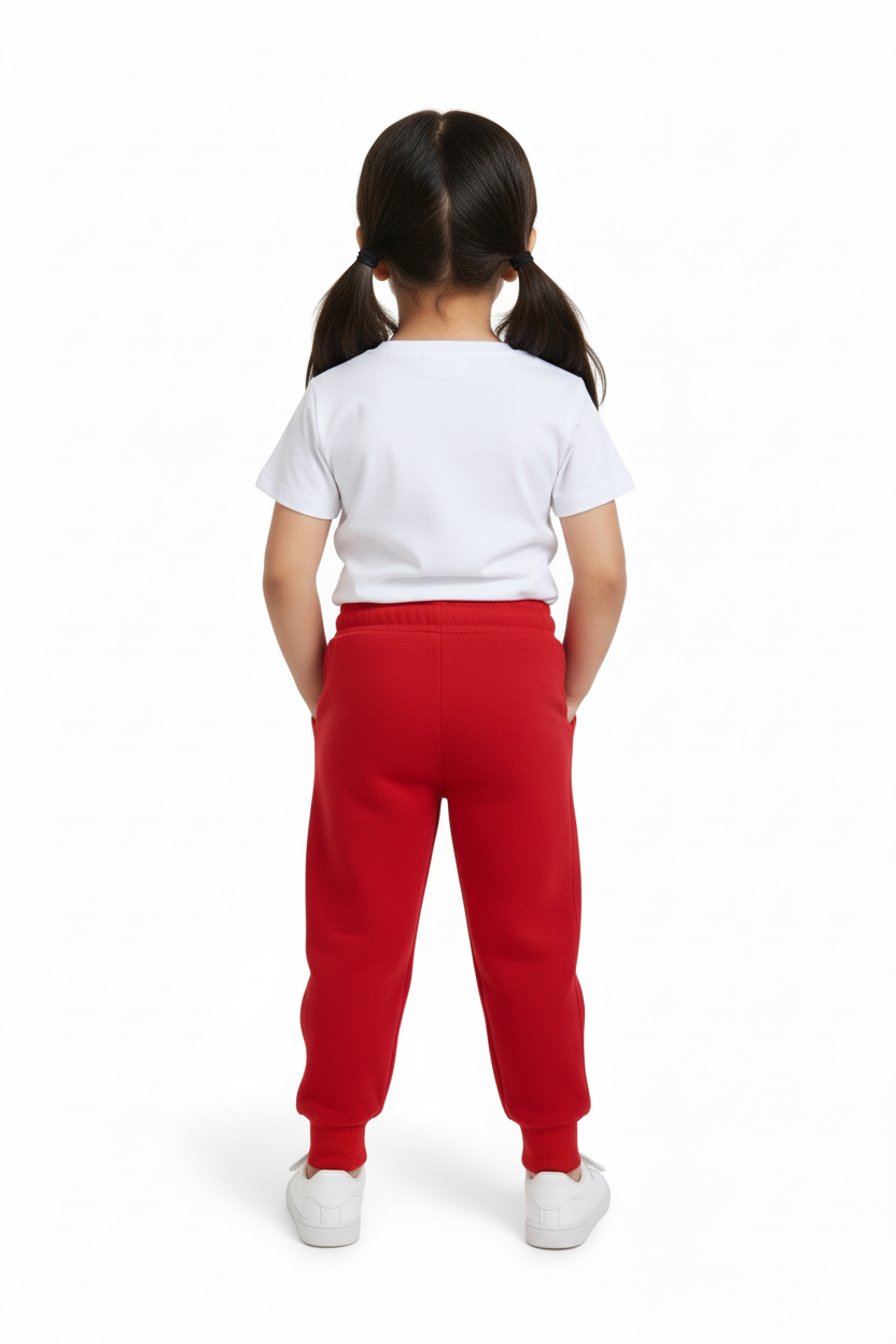 These red jogger pants bring a pop of color to your child’s wardrobe while offering all-day comfort. Made with soft, durable fabric, they feature an elastic waistband with a white adjustable drawstring for a secure fit. The ribbed cuffs keep the joggers in place, making them perfect for active play or casual wear.