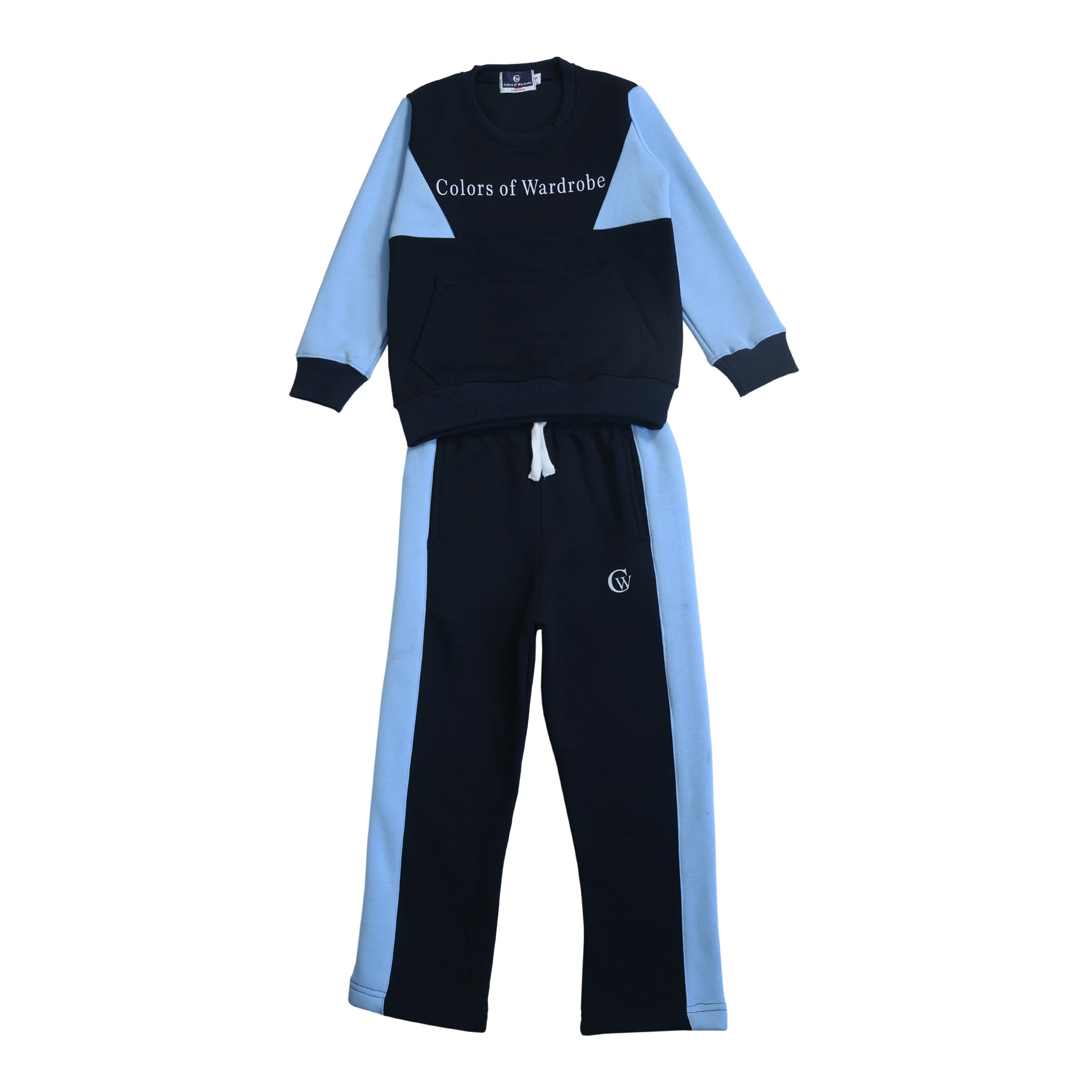 Keep your child looking cool and feeling cozy with this blue and black tracksuit set. Featuring a bold “Colors of Wardrobe” print sweatshirt with a handy front pocket, paired with matching joggers for all-day comfort. Made with soft, breathable fabric—perfect for school, outdoor play, or relaxed everyday wear.